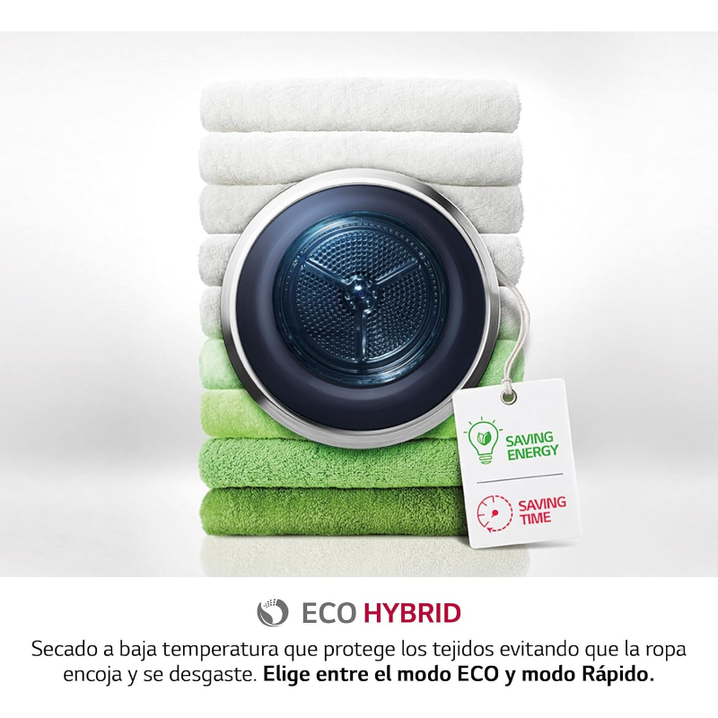 La LG Secadora RH90V9PV2N es un modelo de secadora de bomba de calor con una capacidad de 9 kg. Su clasificación energética es A+++, lo que indica un bajo consumo energético. Este dispositivo cuenta con un motor inverter, que proporciona un funcionamiento eficiente y reduce el ruido durante la operación. La secadora incluye varias configuraciones de secado, que permiten seleccionar el programa adecuado según el tipo de tejido. También incorpora un sistema de gestión de la humedad, que ajusta el tiempo de secado en función del nivel de humedad detectado en la carga. El tambor de la secadora está diseñado para optimizar el movimiento de la ropa, garantizando un secado uniforme. La LG RH90V9PV2N está equipada con un filtro de fácil acceso, que facilita la limpieza y el mantenimiento. Adicionalmente, esta secadora incorpora un sistema de autodiagnóstico que permite detectar posibles fallas en el funcionamiento. La conectividad Wi-Fi posibilita el control remoto y la monitorización del ciclo de secado a través de una aplicación móvil. Este modelo también cuenta con una opción de secado en frío para algunos tejidos sensibles. Su diseño está orientado a la eficiencia en el uso del espacio, con una interfaz de usuario sencilla que simplifica la selección de programas. La LG Secadora RH90V9PV2N está fabricada con materiales que cumplen con las normativas de seguridad y eficiencia energética aplicables. Este aparato es compatible con la carga de diversos tipos de prendas, incluyendo algodón y sintéticos, y cuenta con distintos niveles de secado para adaptarse a las necesidades del usuario.